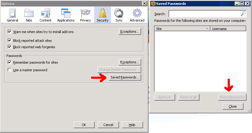 Click on the ‘Security’ tab and click on the ‘saved passwords’ button on the bottom right. A new window will pop up (see below) – to see passwords, press the ‘Show passwords’ button on the bottom right.